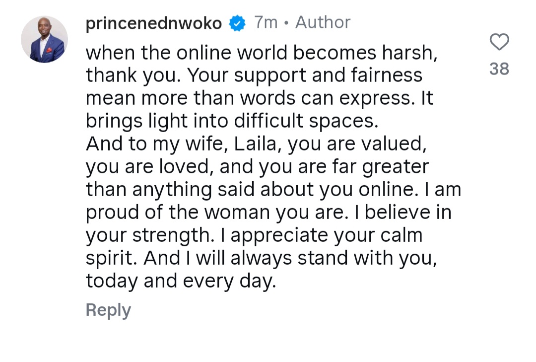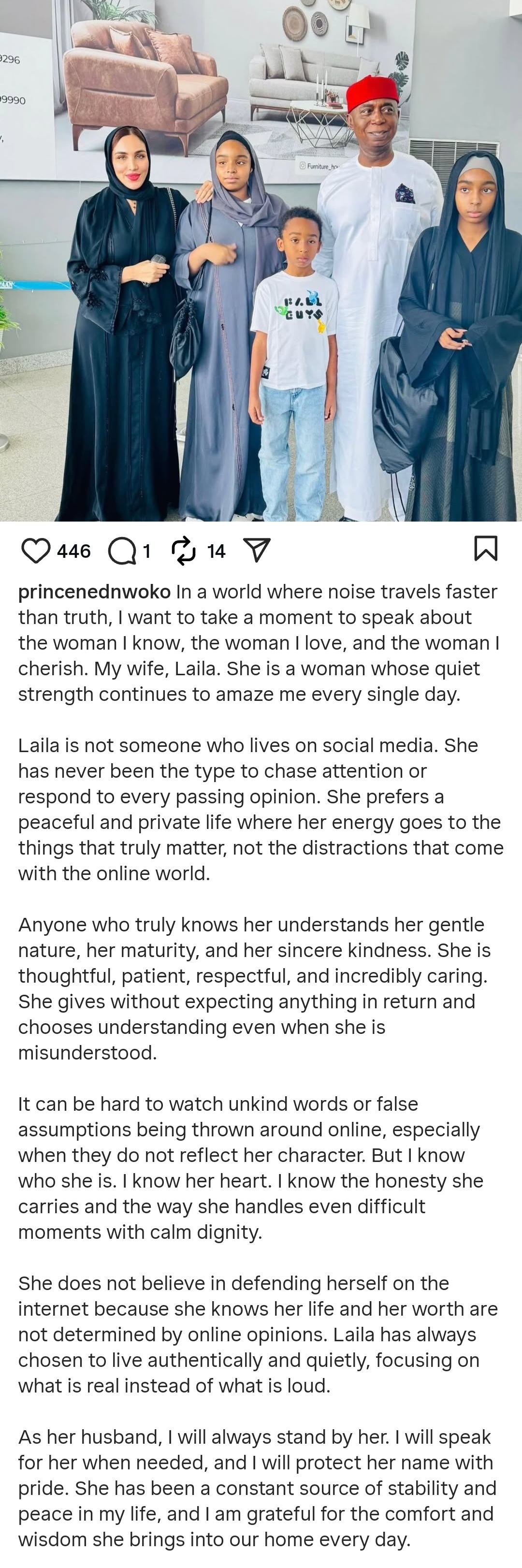 Ned Nwoko has gone on Instagram to extol the virtues of his wife Laila Charani. The politician shared a photo of him, Laila, and their children, then went on to speak highly of her. This comes amid his estrangement from his youngest wife Regina Daniels, whom he used to speak highly of, but he now accuses of being a drug addict after she accused him of domestic violence. He wrote on Wednesday morning, Dec. 3: "In a world where noise travels faster than truth, I want to take a moment to speak about the woman I know, the woman I love, and the woman I cherish. My wife, Laila. She is a woman whose quiet strength continues to amaze me every single day. "Laila is not someone who lives on social media. She has never been the type to chase attention or respond to every passing opinion. She prefers a peaceful and private life where her energy goes to the things that truly matter, not the distractions that come with the online world. "Anyone who truly knows her understands her gentle nature, her maturity, and her sincere kindness. She is thoughtful, patient, respectful, and incredibly caring. She gives without expecting anything in return and chooses understanding even when she is misunderstood. "It can be hard to watch unkind words or false assumptions being thrown around online, especially when they do not reflect her character. But I know who she is. I know her heart. I know the honesty she carries and the way she handles even difficult moments with calm dignity. "She does not believe in defending herself on the internet because she knows her life and her worth are not determined by online opinions. Laila has always chosen to live authentically and quietly, focusing on what is real instead of what is loud. "As her husband, I will always stand by her. I will speak for her when needed, and I will protect her name with pride. She has been a constant source of stability and peace in my life, and I am grateful for the comfort and wisdom she brings into our home every day. "Laila has a depth of character that many may never see because she does not display her life publicly. She moves quietly, loves quietly, and carries herself with grace. Her strength does not shout. Her goodness does not need an audience. She simply remains true to who she is. "Over the years, I have seen her handle challenges with patience and grace that inspire me. She does not rush to prove herself to anyone. She allows time, truth, and character to speak for her. That is one of the many reasons I respect her deeply. "To everyone who has shown understanding, compassion, and kindness during moments When the online world becomes harsh, thank you. Your support and fairness mean more than words can express. It brings light into difficult spaces. And to my wife, Laila, you are valued, you are loved, and you are far greater than anything said about you online. I am proud of the woman you are. I believe in your strength. I appreciate your calm spirit. And I will always stand with you, today and every day."