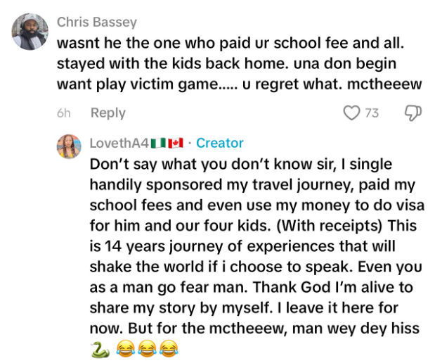 A Nigerian woman, Loveth, has said she regrets knowing her husband and bringing him to Canada.  While the mother of four didn't elaborate on the reasons she is looking back at her 14-year marriage with regret, she expressed gratitude to God for keeping her alive to share her story.   She shared a video from when she received her husband and their children upon arrival in Canada. Responding to a follower who suggested that her husband paid her school fees, Loveth revealed that she singlehandedly sponsored her relocation to Canada and paid her school fees. She further revealed that she also sponsored her husband their children's relocation to Canada.  This is 14 years journey of experiences that will shake the world if I choose to speak. Even you as a man go fear man. Thank God I 'm alive to share my story by myself. I leave it here for now.  Watch the video below     View this post on Instagram           A post shared by Lindaikejiblog (@lindaikejiblogofficial) The post Thank God Im alive to share my story - Nigerian woman expresses regret of bringing her husband to Canada (video) appeared first on Linda Ikeji Blog.