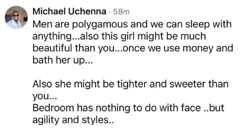 A Nigerian man, Michael Uchenna, has mocked Ada Igbo, after she accused her estranged husband of impregnating their maid. Commenting on her post, Michael stated that men are polygamous in nature and can sleep with anything as long as it's sweet. He mocked Ada, saying that the maid might be tighter, sweeter and better in bed than her. Taking to his Facebook page, he claimed that the maid also looks more beautiful than Ada. "Her husband impregnated her maid. Now in several posts have seen women attacking this maid and calling her this and that...saying how can a man cheat on his classy wife with this," he wrote. I laughwomen don't know men... a man can sleep with anything as far as it's sweet....that's how God built us. Also this maid look far more beautiful than the madam. Let just use money and bath her up now you will know that this maid is naturally beautiful. Also, bedroom activities has nothing to do with face rather agility, flexibility and talent in different styles. May be the madam is not good in bed. That's why I always tell men test the woman your to marry and make sure she can kwench your bedroom hunger...so that you will not end up cheating on her in marriageit's not every shinny woman you see can please a man in the bedroom.