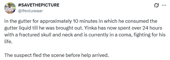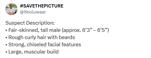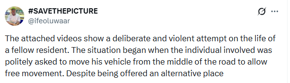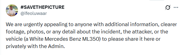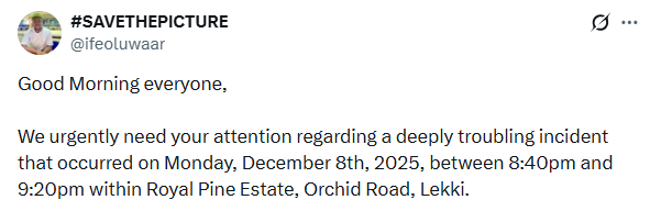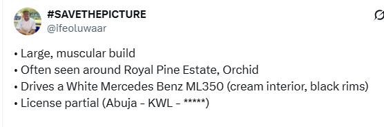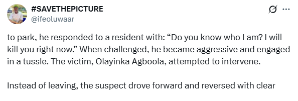 A 36-year-old realtor, Yinka Agboola, has d!ed after he was knocked down by a yet-to-be-identified Mercedes Benz driver during a dispute over a parking space at Royal Pine Estate on Orchid Road, Lekki, Lagos State. It was gathered that the incident occurred on Monday night, December 8, 2025. The victim's sister, Agboola Oluwadamilola, who confirmed the incident to punch said Yinka succumbed to his injuries in the early hours of Wednesday, December 11. She said that the incident had been reported to the Ajah police station, adding that the whereabouts of the suspect were still unknown. I went to the Ajah police station. The witnesses have been there before, but I went there yesterday to give my own statement, she said. One @Ifeoluwaar, who raised the alarm in a series of posts on X, disclosed that residents found the suspect's vehicle (a white Mercedes Benz ML350) obstructing the road and offered him an alternative parking spot. However, the driver reportedly became aggressive and threatened to k!ll one of the residents. The confrontation escalated into a scuffle, prompting Agboola, also a resident, to intervene. The situation began when the individual involved was politely asked to move his vehicle from the middle of the road to allow free movement. Despite being offered an alternative place to park, he responded to a resident with, Do you know who I am? I will kill you right now, Ifeoluwa narrated. When challenged, he became aggressive and engaged in a tussle. The victim, Olayinka Agboola, attempted to intervene. The X user further revealed that the suspect entered his vehicle and, rather than leaving the scene, allegedly drove forward and reversed in a threatening manner. According to @Ifeoluwaar, Agboola attempted to restrain the driver, but the suspect sped off with him clinging to the steering wheel before knocking him against a pavement. While residents tried to stop him and prevent his escape, Yinka attempted to restrain him, but the suspect sped off with him hanging onto the steering wheel. He then slammed the brakes, throwing Yinka violently onto the pavement and into a gutter, leaving him unconscious, the post read. The footage of the incident, captured by a closed-circuit television camera and attached to the post, showed a white Mercedes-Benz reversing dangerously as it attempted to hit a group of people. Another clip recorded the moment Agboola was knocked down as the vehicle sped off. Residents made frantic efforts to revive Agboola, who was said to be battling for his life in the Intensive Care Unit of an undisclosed hospital. The X user described the fleeing driver as fair-skinned, tall, with curly hair, strong, chiseled facial features and muscular built.