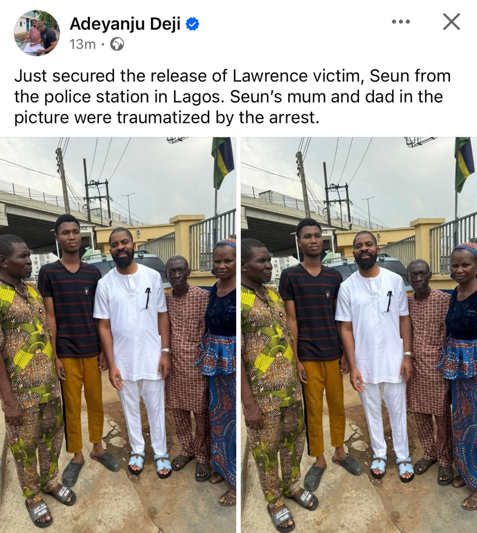 Lawyer, Deji Adeyanju, has secured the release of upcoming content creator, Banger Boy, who was arrested on Friday, by UK-based content creator Lawrence Alabi over alleged cyberbullying and defamatory posts targeted at him and his wifeAlabi claimed he and his wife had suffered series of cyberb#llying and defamatory attacks from Banger Boy. He flew into Lagos and effected his arrest. Videos of him picking up Banger Boy as well as the young man pleading with him in the police station surfaced online. While some Nigerians applauded him for arresting Banger Boy, others accused him of using the police to humiliate and harass the upcoming content creator.This afternoon, Deji disclosed that he has been able to secure the release of Banger Boy. The post Update: Lawyer, Deji Adeyanju, secures release of upcoming content creator, Banger Boy, arrested by UK-based content creator Lawrence Alabi over alleged cyberbullying appeared first on Linda Ikeji Blog.