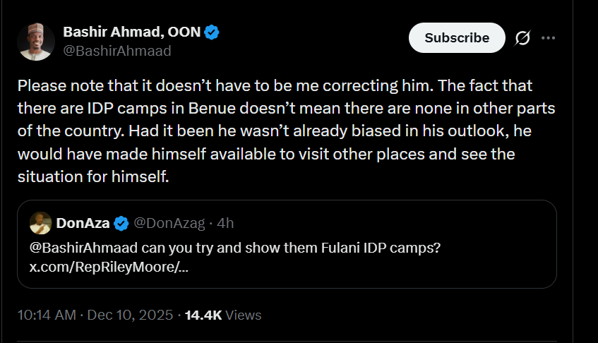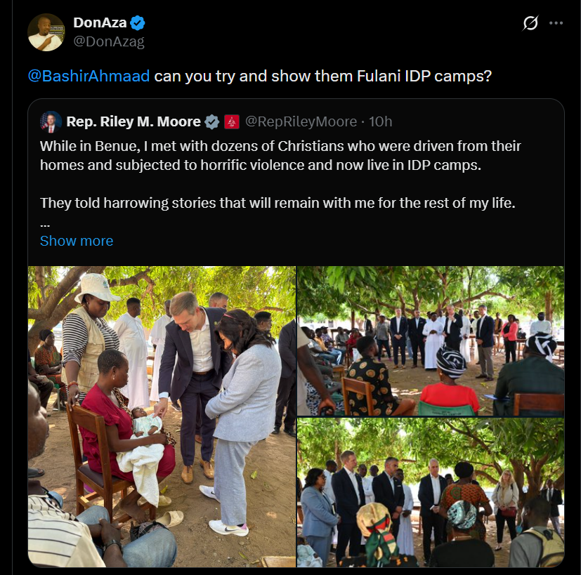 Reacting to the claims, Bashir, a former presidential spokesperson, accused Moore of failing to present a balanced picture of the humanitarian situation in Nigeria. In a post on his official X handle, he questioned why the American lawmaker did not extend his visit to other parts of the country where displaced Muslims are also taking refuge in IDP camps. The fact that there are IDP camps in Benue doesnt mean there are none in other parts of the country. Had it been he wasnt already biased in his outlook, he would have made himself available to visit other places and see the situation for himself, Bashir said.