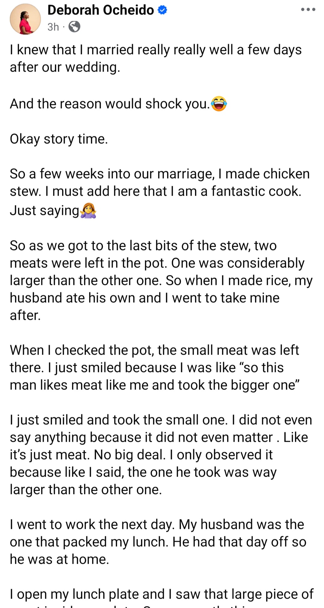 A woman has shared what happened days after her wedding that made it clear to her that she married the right partner. Deborah Ocheido took to Facebook to share how her husband put his need above hers. She said that singular incident reassured her that she chose well. She wrote: "I knew that I married really really well a few days after our wedding. And the reason would shock you." She continued: "So a few weeks into our marriage, I made chicken stew. I must add here that I am a fantastic cook. Just saying "So as we got to the last bits of the stew, two meats were left in the pot. One was considerably larger than the other one. So when I made rice, my husband ate his own and I went to take mine after. "When I checked the pot, the small meat was left there. I just smiled because I was like 'so this man likes meat like me and took the bigger one'. "I just smiled and took the small one. I did not even say anything because it did not even matter . Like its just meat. No big deal. I only observed it because like I said, the one he took was way larger than the other one. "I went to work the next day. My husband was the one that packed my lunch. He had that day off so he was at home. "I open my lunch plate and I saw that large piece of meat inside my plate. So apparently this man remembered that I was going to work the next day, he took that meat and kept in the fridge for me. And put it in my lunch bag for work. "So apparently he ate his food that night without meat. "And this singular act meant so much to me. I saw him for who he was. "I mean I already knew how kind and selfless my husband was. Thats one of the many reason I married him. I saw the way he took care of his family, I had see him go out of his way to help people. So I knew already. "But I saw him again. I saw a man that would take care of us. "I saw a man that would think about my tomorrow and make plans for me even when I wasnt aware. "I saw a man that would let go of his own pleasure to make sure his wife was enjoying. It was not your typical 'the biggest meat is for daddy' "I know its just meat. And honestly, it wasnt about meat because trust me, meat is not one of our prayer requests. God has given us enough meat. "It was the mindset behind the act. "One of the biggest blessings God can give you in this day and age is a good husband or a good wife. "If you have a good, you better be doing thanksgiving everyday. "To find one now in todays world you need to have serious connections."