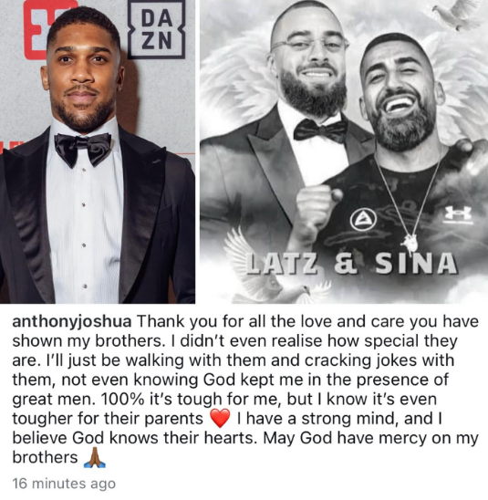 International boxer, Anthony Joshua, has again expressed sadness over the demise of two of his friends who passed away in an accident he was involved in. Joshua was involved in a fatal accident when his vehicle crashed into a stationary truck on the Lagos-Ibadan Expressway in Makun,Ogun state on December 29, 2025. The 36-year-old escaped with only minor injuries, but his close friends and team members Sina Ghami and Latif Latz Ayodele d!ed at the scene. Their funerals took place at a London mosque on Sunday, January 4, with Joshua present to pay his final respects. In a post shared in his IG page this afternoon, Joshua thanked everyone for the outpouring of love since the unfortunate incident happened. He stated that the incident is 100% on him but can only imagine what the parents of the deceased men are going through. He prayed for God to have mercy on their souls.