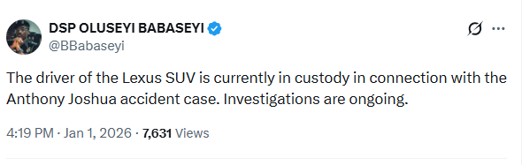 The Ogun state police command has confirmed the arrest of the driver of a Lexus Sports Utility Vehicle (SUV) in connection with the Anthony Joshua accident. The confirmation was made by the spokesperson of the command, DSP Oluseyi Babaseyi, on his X page on Thursday, January 1. Babaseyi mentioned that investigations into the incident were still ongoing. The driver of the Lexus SUV is currently in custody in connection with the Anthony Joshua accident case. Investigations are ongoing.Babaseyi tweeted Joshua and the two of his friends were communting along the Lagos-Ibadan expressway when the accident occurred in Makun, Ogun State. The Lexus SUV they were riding in collided with a stationary truck along the road, k!lling his friends Latif and Sina instantly and leaving Joshua with some injuries.. The victims flew into Nigeria to spend the Christmas holiday with Joshua before the tragic incident cut their visit short.  .