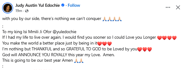 Actress, Judy Austin, has taken to social media to profess her love for her hubby, Yul Edochie. In a post shared on Facebook, Judy mentioned that If she had to live her life all over again, she would find Yul quickly so she could love him longer. A post from Yul reads''with you by our side, theres nothing we cant conquer:To my king Isi Mmili Ji Ofor @yuledochieIf I had my life to live over again, I would find you sooner so I could Love you LongerYou make the world a better place just by being in itIm nothing but THANKFUL and so GRATEFUL TO GOD to be Loved by youGod will ANNOUNCE YOU ROYALLY this year my Love. Amen.This is going to be our best year Amen''