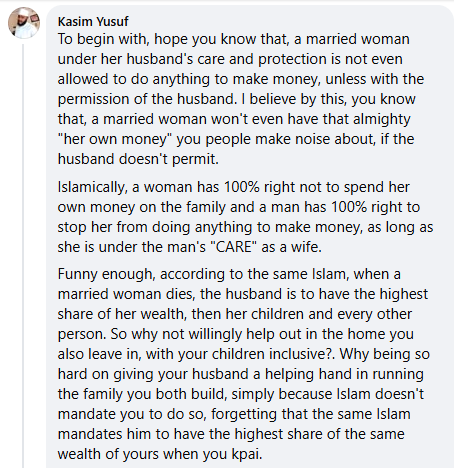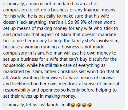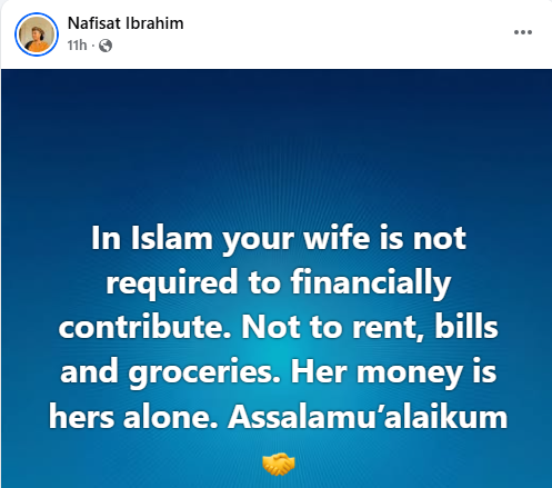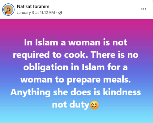A Nigerian woman, Nafisat Ibrahim has stated that a wife is not required to cook for her husband or contribute financially to the marriage. According to Nafisat, a woman's money solely belongs to her and anything she does for the family is kindness not duty. In Islam your wife is not required to financially contribute. Not to rent, bills and groceries. Her money is hers alone. Assalamualaikum, she wrote in a Facebook post on Monday, January 5. In Islam a woman is not required to cook. There is no obligation in Islam for a woman to prepare meals. Anything she does is kindness not duty, she stated earlier. Reacting to her post, one Kasim Yusuf, said that in Islam, a married woman under her husband's care and protection is not even allowed to do anything to make money, unless with his permission. "I believe by this, you know that, a married woman won't even have that almighty "her own money" you people make noise about, if the husband doesn't permit," he added.