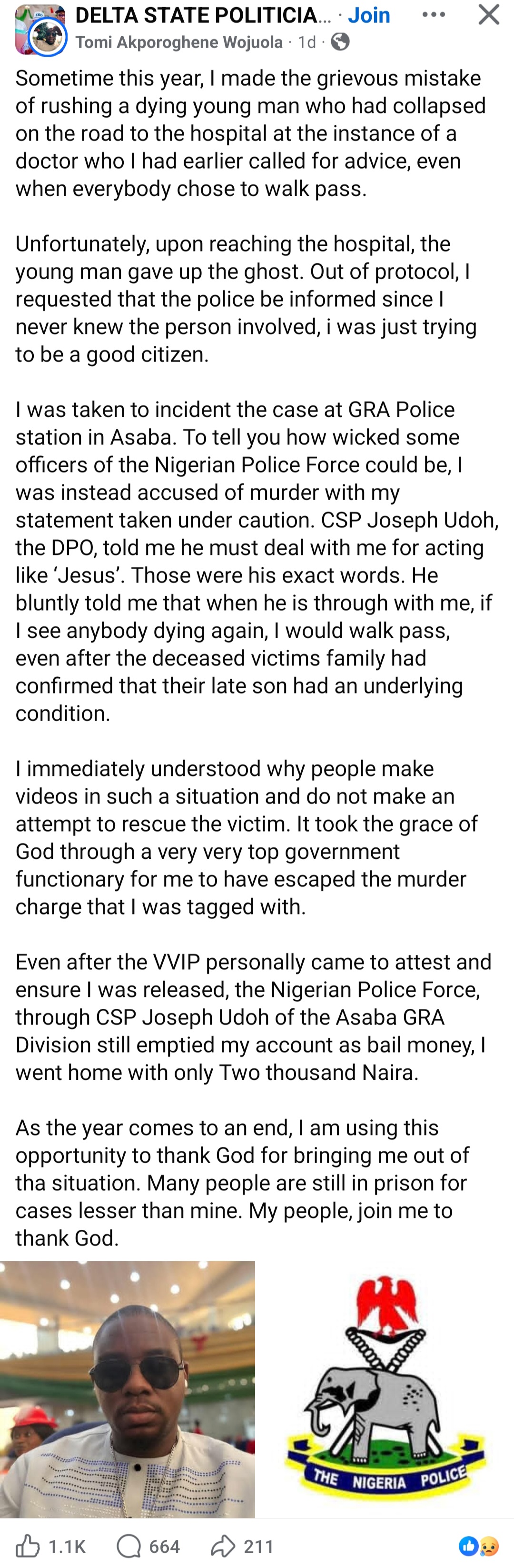 A man has shared his regret after rushing a dy!ng man to the hospital. Tomi Wojuola narrated how he took the man, who had collapsed on the road, to a hospital. Sadly, the man did and a police report was filed. However, he claimed the police punished him by allegedly accusing him of murdr while threatening to deal with him. He said it was the grace of God that saved him from the ordeal. He wrote: "Sometime this year, I made the grievous mistake of rushing a dying young man who had collapsed on the road to the hospital at the instance of a doctor who I had earlier called for advice, even when everybody chose to walk pass. "Unfortunately, upon reaching the hospital, the young man gave up the ghost. Out of protocol, I requested that the police be informed since I never knew the person involved, i was just trying to be a good citizen. "I was taken to incident the case at GRA Police station in Asaba. To tell you how wicked some officers of the Nigerian Police Force could be, I was instead accused of murdr with my statement taken under caution. CSP Joseph Udoh, the DPO, told me he must deal with me for acting like Jesus. Those were his exact words. He bluntly told me that when he is through with me, if I see anybody dying again, I would walk pass, even after the deceased victims family had confirmed that their late son had an underlying condition. "I immediately understood why people make videos in such a situation and do not make an attempt to rescue the victim. It took the grace of God through a very very top government functionary for me to have escaped the murdr charge that I was tagged with. "Even after the VVIP personally came to attest and ensure I was released, the Nigerian Police Force, through CSP Joseph Udoh of the Asaba GRA Division still emptied my account as bail money, I went home with only Two thousand Naira. As the year comes to an end, I am using this opportunity to thank God for bringing me out of that situation. Many people are still in prison for cases lesser than mine. My people, join me to thank God.