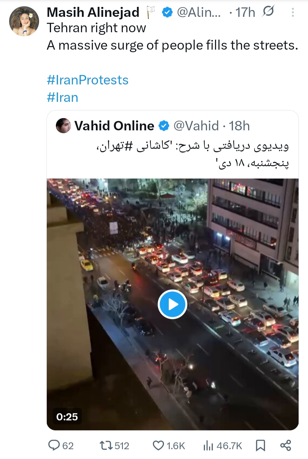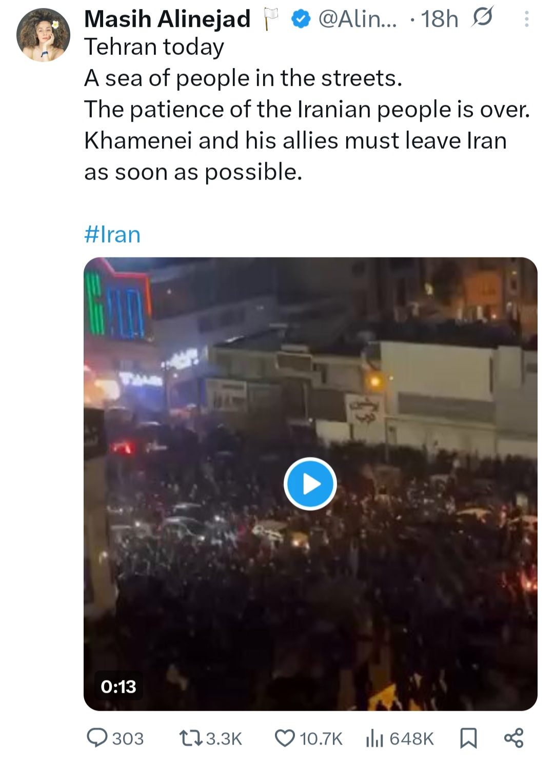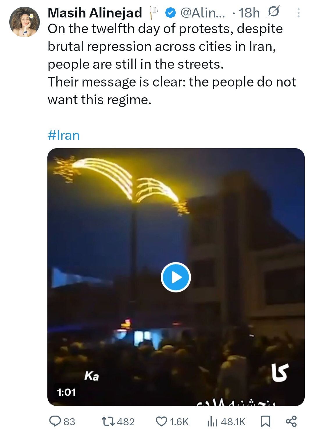 Twelve days of nationwide protests in Iran have led to 42 deaths, dozens of injuries, and more than 2,200 arrests, according to human rights groups. The demonstrations, driven by economic woes, have spread to all 31 provinces. The protests, which began late last month, were triggered by a severe economic crisis and the rapid devaluation of the Iranian rial. Demonstrations have occurred in major cities including Tehran, Mashhad, and Shiraz, as well as in areas with significant ethnic populations, such as the predominantly Turkish-majority provinces of Tabriz and Ardabil. Authorities have reportedly cut internet and phone services, and injuries have been attributed to pellet shots and plastic bullets. The nationwide protests in Iran have claimed the lives of 42 people, according to a report by the US-based Iran Human Rights Activists News Agency (HRANA). The agency stated that 34 protesters and eight security force members were k!lled, with dozens injured and 2,217 individuals detained across all 31 provinces of the country. Meanwhile, US President Donald Trump issued a warning to Iran on Thursday, stating, "If they start k!lling people... we're going to hit them very hard."  Iranian journalist and activist, Masih Alinejad has been sharing videos showing events as they occur. She wrote: "47 years ago, the Islamic Republic took our rights and turned a nation into hostages. Today people have nothing left to lose, they rise. Iran is rising."  See videos below.  Tehran todayA sea of people in the streets.The patience of the Iranian people is over. Khamenei and his allies must leave Iran as soon as possible.#Iran pic.twitter.com/Wx2CddZ3YT Masih Alinejad (@AlinejadMasih) January 8, 2026   Im not afraid. Ive been dead for 47 years this is the voice of a woman in Iran who is fed up with the Islamic republic.47 years ago, the Islamic Republic took our rights and turned a nation into hostages.Today people have nothing left to lose, they rise.Iran is rising. pic.twitter.com/GAawmynE0C Masih Alinejad (@AlinejadMasih) January 8, 2026  On the twelfth day of protests, despite brutal repression across cities in Iran, people are still in the streets. Their message is clear: the people do not want this regime.#Iran pic.twitter.com/J74D7rwSuk Masih Alinejad (@AlinejadMasih) January 8, 2026  .