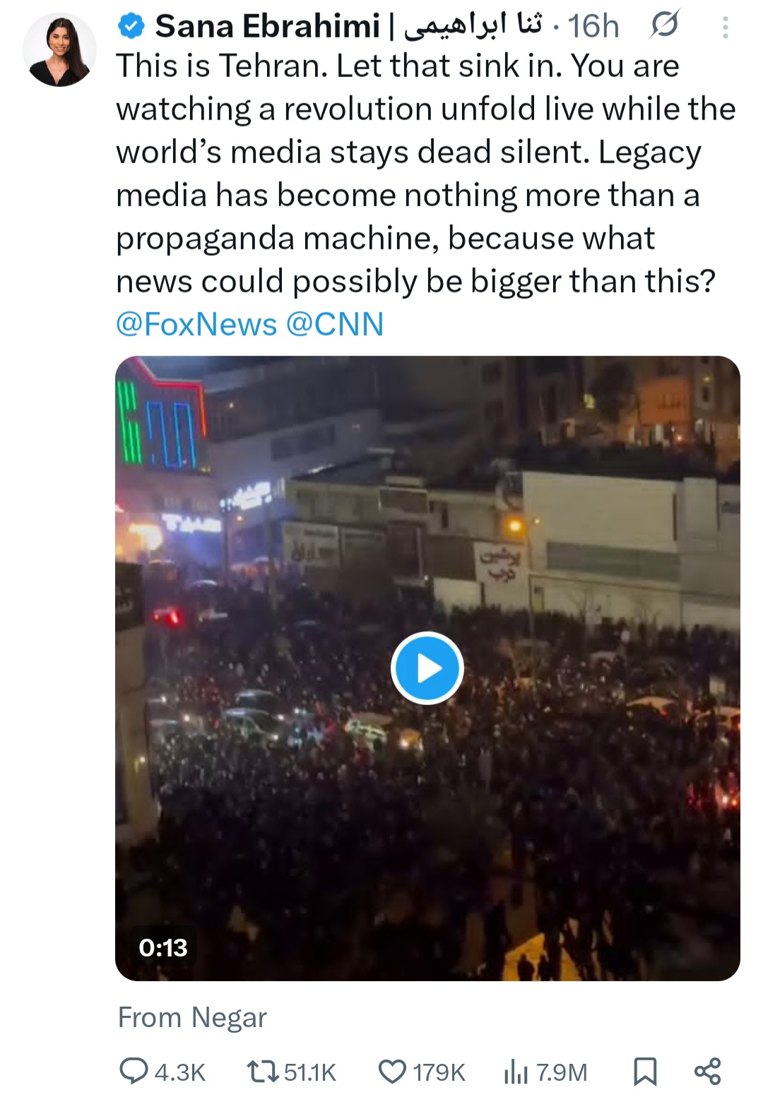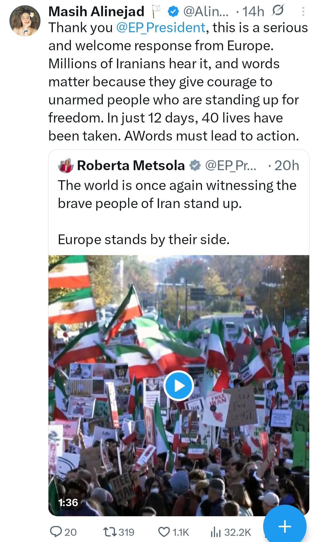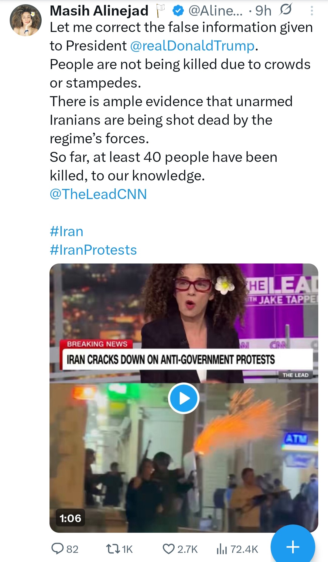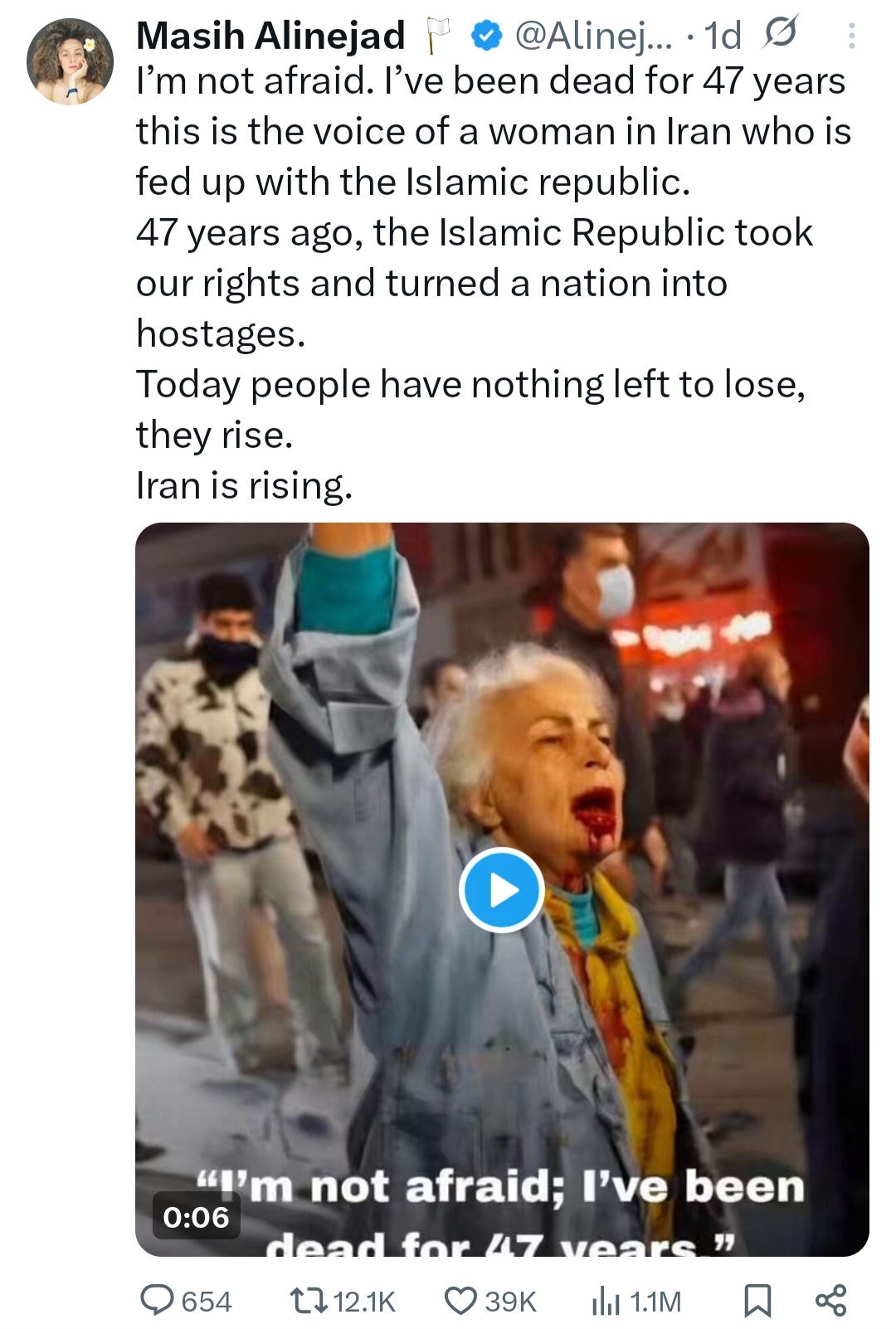 Twelve days of nationwide protests in Iran have led to 42 deaths, dozens of injuries, and more than 2,200 arrests, according to human rights groups. The demonstrations, driven by economic woes, have spread to all 31 provinces. The protests, which began late last month, were triggered by a severe economic crisis and the rapid devaluation of the Iranian rial. Demonstrations have occurred in major cities including Tehran, Mashhad, and Shiraz, as well as in areas with significant ethnic populations, such as the predominantly Turkish-majority provinces of Tabriz and Ardabil. Authorities have reportedly cut internet and phone services, and injuries have been attributed to pellet shots and plastic bullets. The nationwide protests in Iran have claimed the lives of 42 people, according to a report by the US-based Iran Human Rights Activists News Agency (HRANA). The agency stated that 34 protesters and eight security force members were k!lled, with dozens injured and 2,217 individuals detained across all 31 provinces of the country. Meanwhile, US President Donald Trump issued a warning to Iran on Thursday, stating, "If they start k!lling people... we're going to hit them very hard."  Iranian journalist and activist, Masih Alinejad has been sharing videos showing events as they occur. She wrote: "47 years ago, the Islamic Republic took our rights and turned a nation into hostages. Today people have nothing left to lose, they rise. Iran is rising."  See videos below.  Tehran todayA sea of people in the streets.The patience of the Iranian people is over. Khamenei and his allies must leave Iran as soon as possible.#Iran pic.twitter.com/Wx2CddZ3YT Masih Alinejad (@AlinejadMasih) January 8, 2026   Im not afraid. Ive been dead for 47 years this is the voice of a woman in Iran who is fed up with the Islamic republic.47 years ago, the Islamic Republic took our rights and turned a nation into hostages.Today people have nothing left to lose, they rise.Iran is rising. pic.twitter.com/GAawmynE0C Masih Alinejad (@AlinejadMasih) January 8, 2026  On the twelfth day of protests, despite brutal repression across cities in Iran, people are still in the streets. Their message is clear: the people do not want this regime.#Iran pic.twitter.com/J74D7rwSuk Masih Alinejad (@AlinejadMasih) January 8, 2026  .