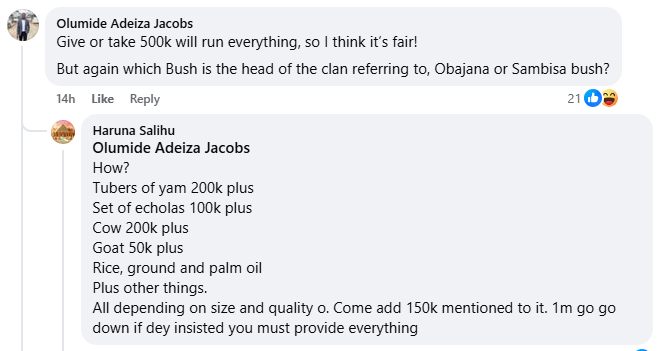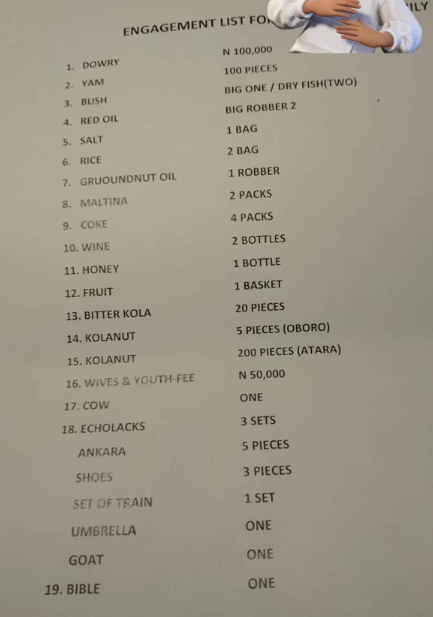 A Kogi woman, Blessing Ahuoyiza, has shared an Ebira wedding engagement list, suggesting that the items are costly. The list outlines the cultural requirements expected of a grooms family ahead of marriage. According to Blessing, the list was given to her uncle by his wife-to-be's family. Dear Some Ebira people, Make una take it easy na, she wrote. The list have sparked widespread conversations with many people saying that the requirements are expensive while some deemed it fair.
