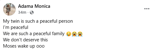 A Nigerian woman, Adama Moses, has been left inconsolable following the d3ath of her beloved twin brother, Moses. In a Facebook post on Monday, January 5, 2026, she asked whoever took her brother to take her life as well. The grieving sister also urged her brother not to rest until he avenges his d3ath. "Okay I thought it was a joke. My Twin, my strength, my mc, my everything is gone. My brother we had plan. This wasn't among the plans. Whoever took you should come and take me oooo," she wrote. Moses you are not resting oo until you avenge your d3ath."